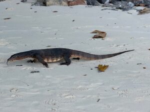 Dann hörst du plötzlich Dinge, die tagsüber untergehen: die Geräusche aus dem Grün, die Schreie der Affen, das Rascheln der Natur. Warane spazieren am Strand entlang, als hätten sie einen festen Arbeitsvertrag hier.
